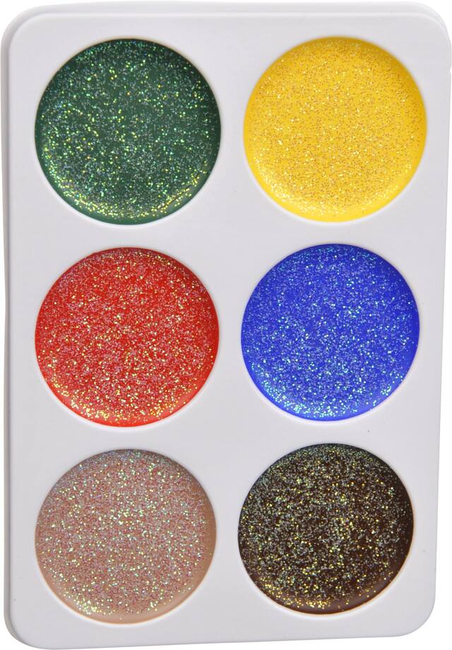 Kit includes glitter grease makeup in green, yellow, red, blue, pink, and purple.