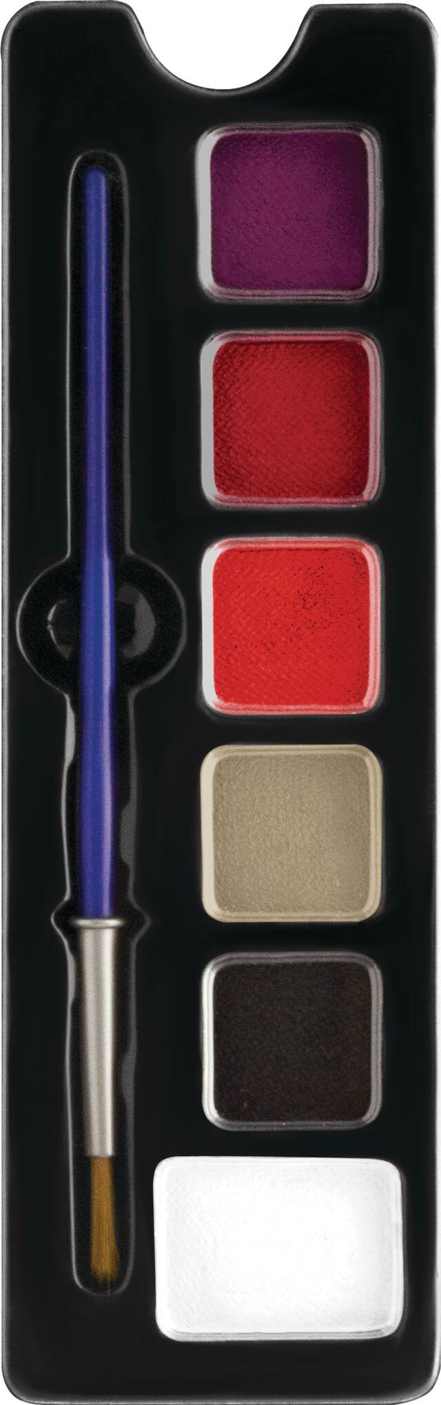Kit includes a premium applicator brush and a palette of six fast-drying, water-activated, and non-smudge colours