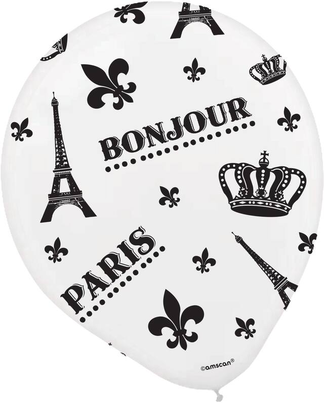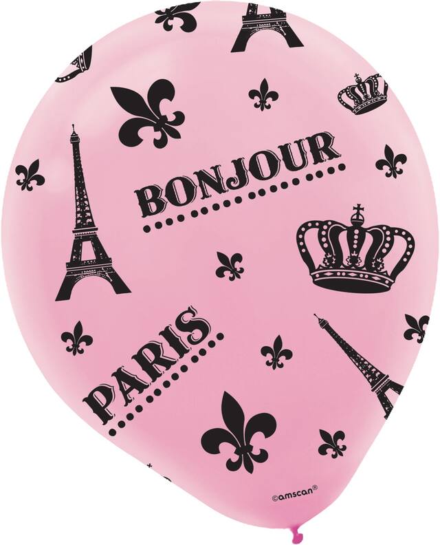 Pink, white, and black latex balloons feature the Eiffel Tower, a fleur-de-lis, and words such as Bonjour and Paris