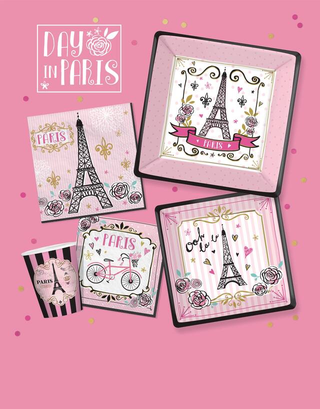 • Large square paper plates feature a large Eiffel Tower with a "Paris" headline and black, gold, and pink accents