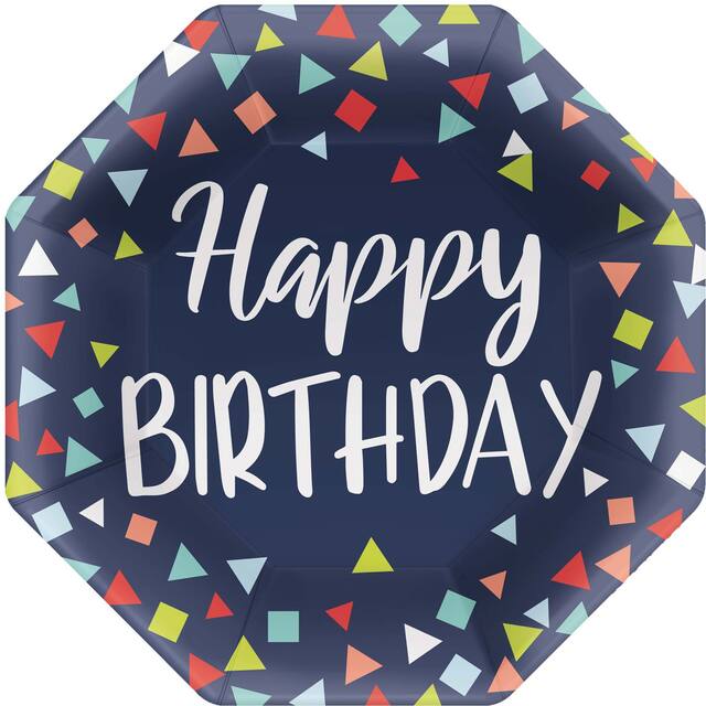These festive octagon-shaped paper plates feature a cheerful confetti design and "Happy Birthday" phrase for your next celebration. With eight plates per pack, there are plenty for guests to enjoy streamers and cake without worrying about dish duty. The bright, colorful design is sure to lift spirits and add some fun to your next party.