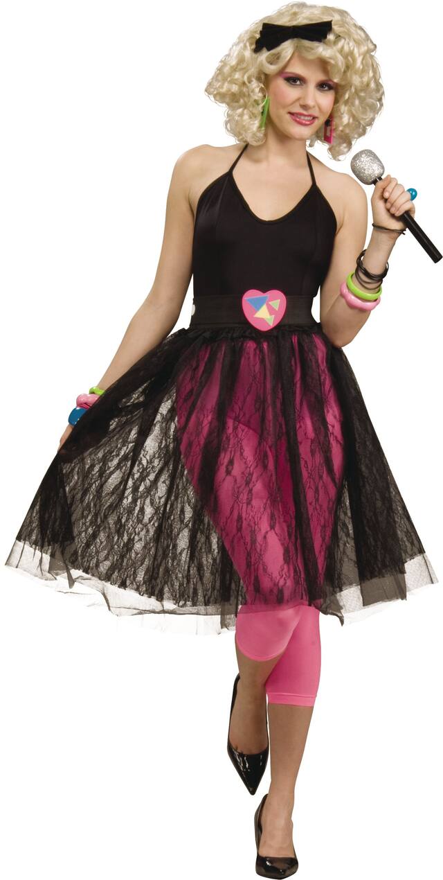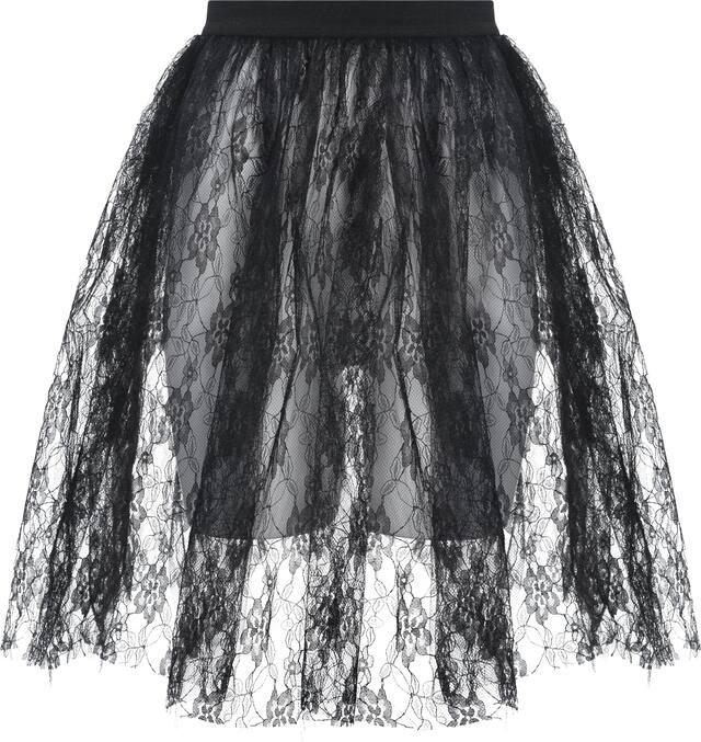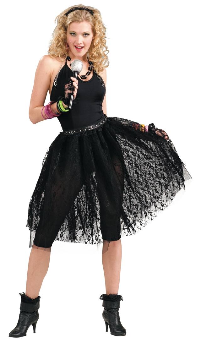 Look funky, flirty, and definitely retro! This 80s Pop Skirt features a knee-length black lace layered over black tulle and ruffled polyester waist accent. An elastic waistband makes the skirt adjustable; one size fits most teens and adults. Silver studded faux leather belt not included.