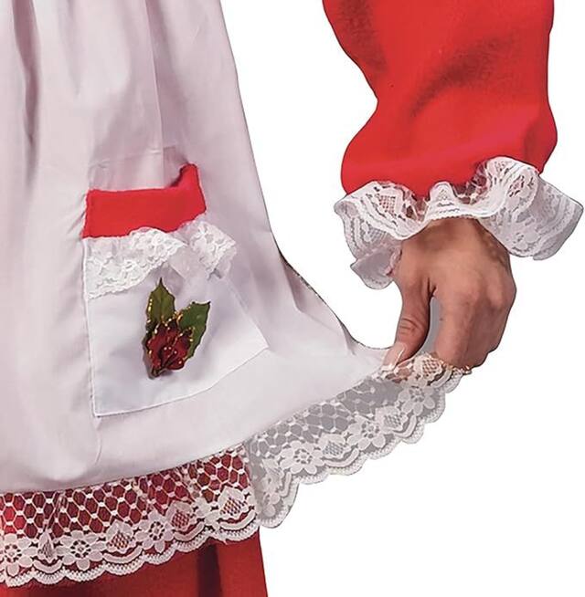 Wear this Mrs. Claus costume to celebrate Christmas in a fun and memorable way. This suite includes a red plush dress with a white apron and mop hat accented with holly berries. This outfit will be ideal for Christmas parties. Anyone who glances at you would wish to possess a costume like this for the next Christmas gathering.