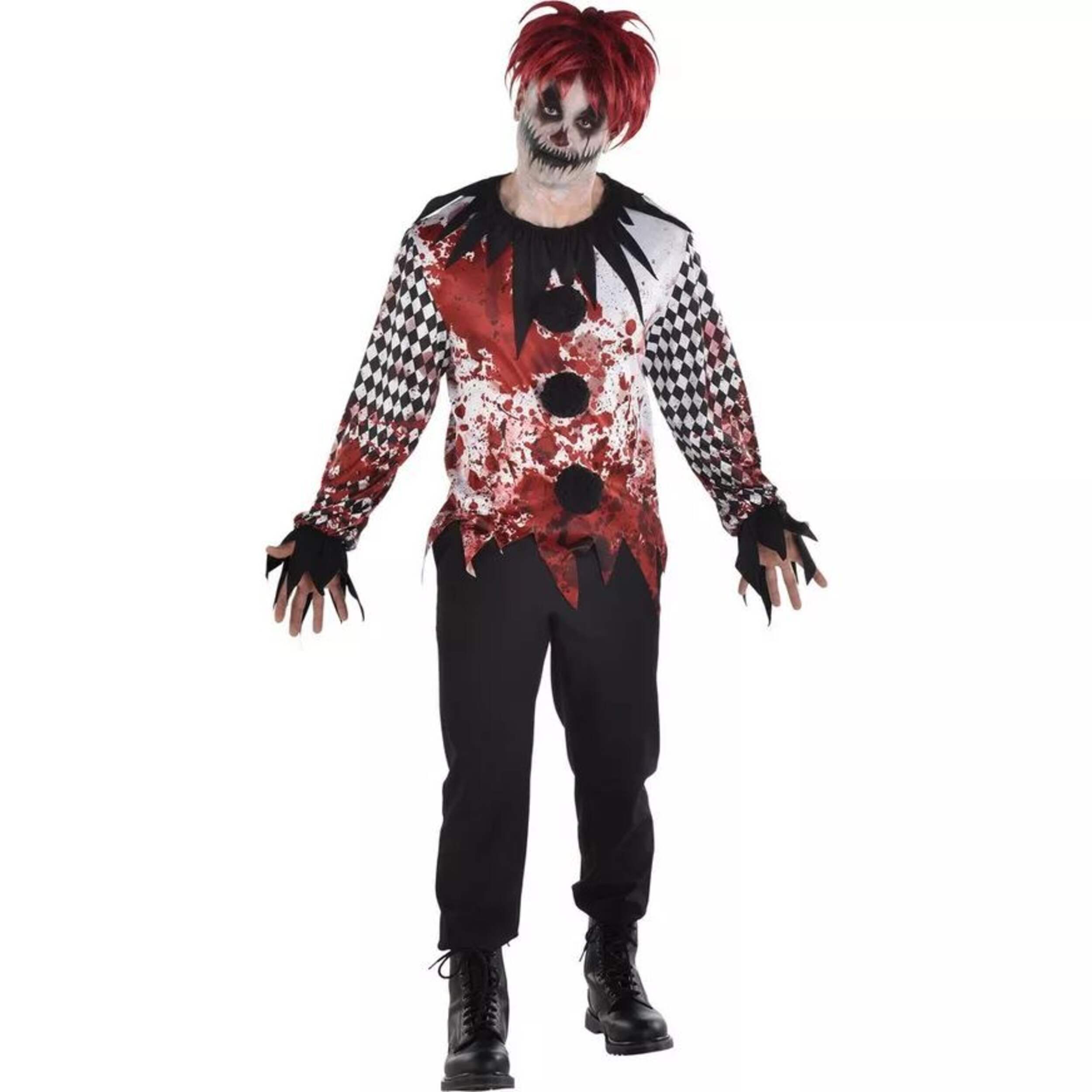 Black puff balls and blood splatters make this spooky shirt the perfect addition to your clown look