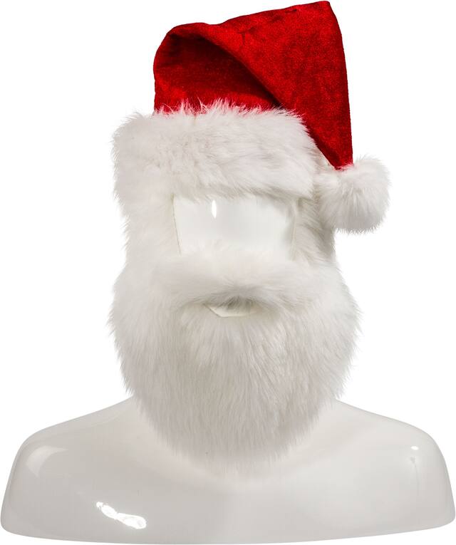 Hat combines a plush red fabric Santa hat with a white Santa beard
