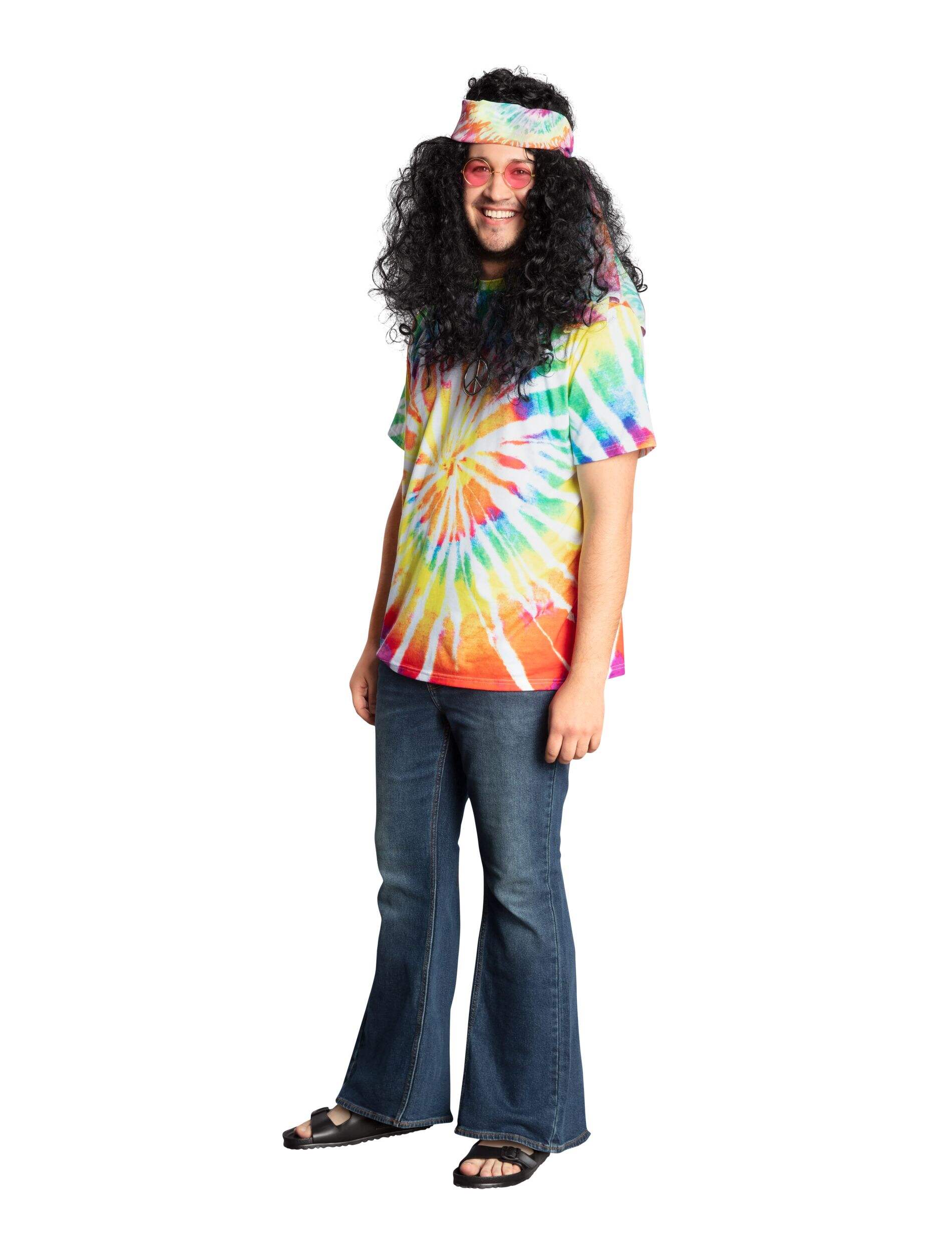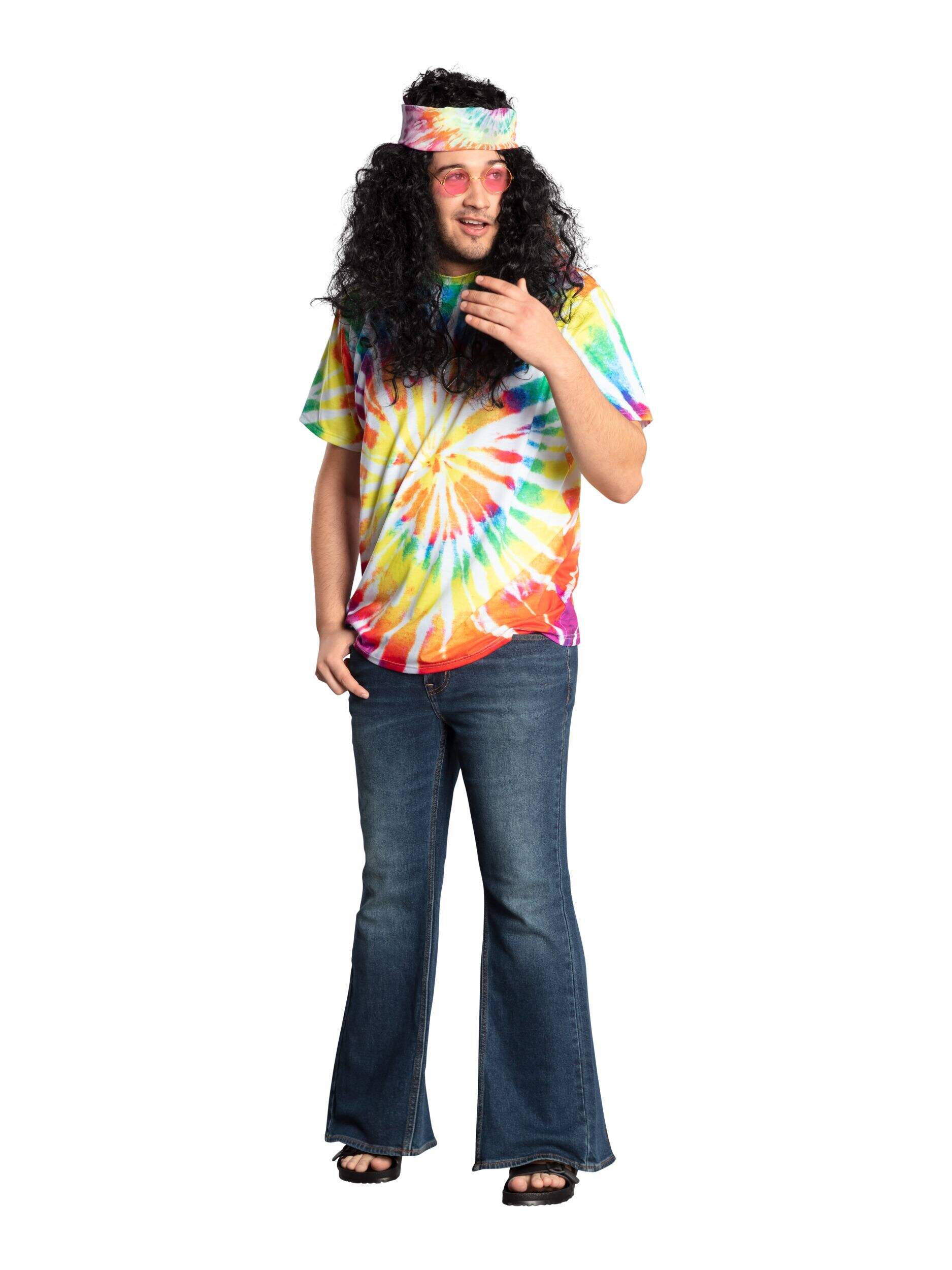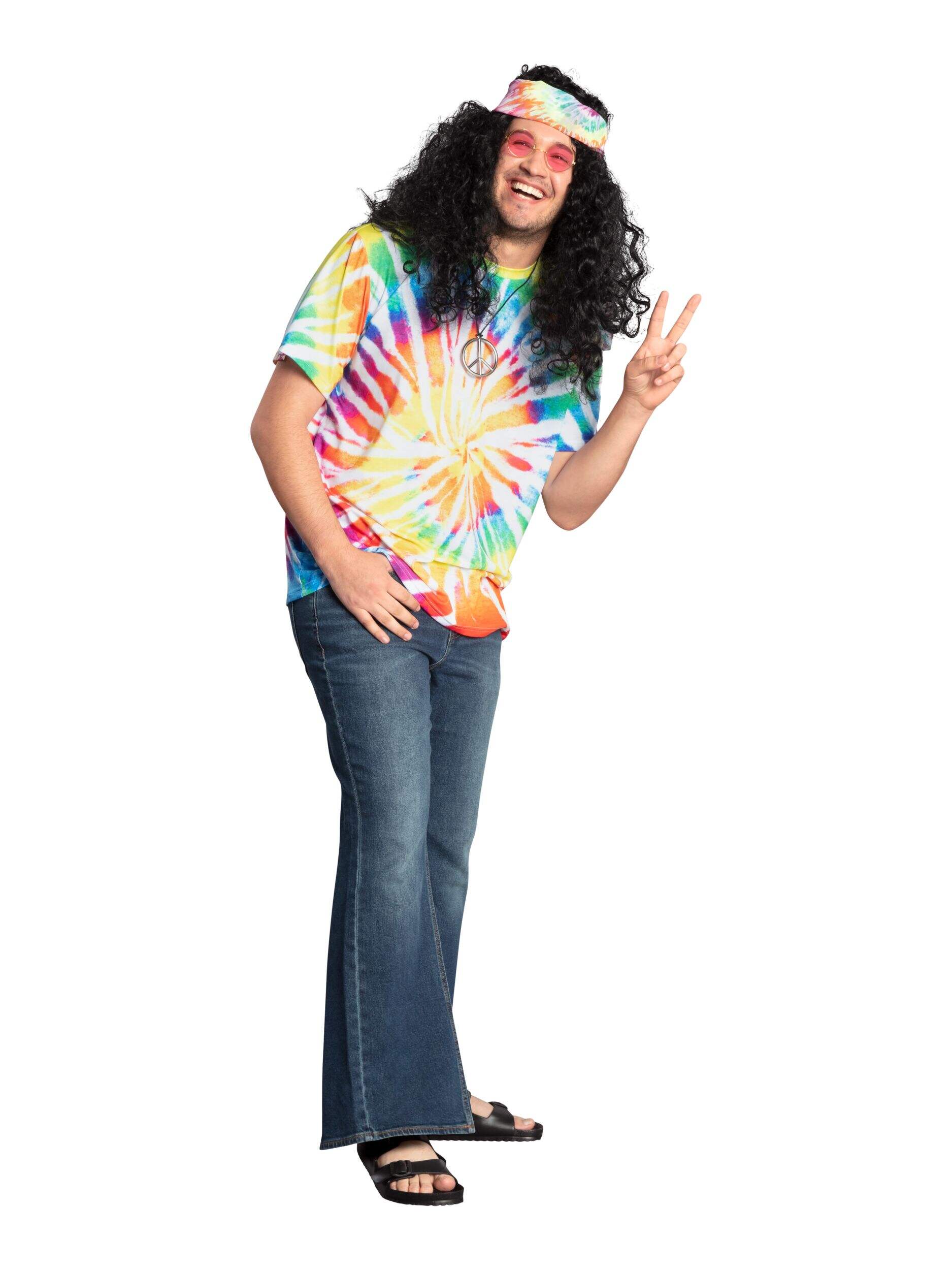The Adult Hippie 1960s Tie-Dye Crewneck T-Shirt has a classic swirl pattern that features every color of the rainbow for a retro look. This T-shirt is made from soft cotton in a standard, comfortable unisex fit. Pair it with flared pants and peace sign accessories for a groovy Halloween costume or party outfit.