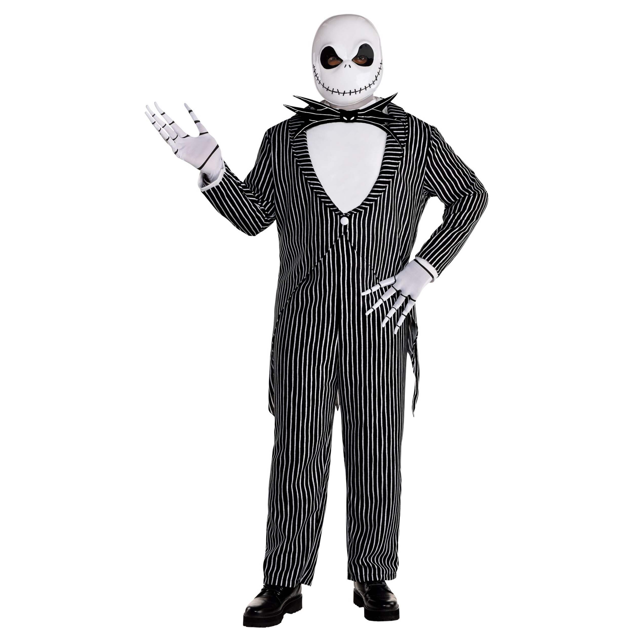 Transform into the Pumpkin King with the Adult Jack Skellington Halloween Costume. This deluxe adult costume includes a black and white pinstripe suit costume, complete with a tailcoat jacket costume and matching trousers. The solid white ascot and oversized bat bowtie add the perfect finishing touches, while the molded Jack mask ensures an authentic look.