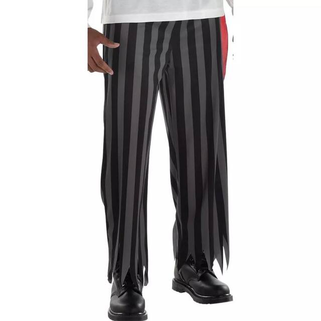 Embrace your inner pirate with Adult Jagged-Hem Pirate Pants. Perfect for Halloween or themed parties, these pants feature a striking black and grey striped design with a jagged hem, adding an authentic touch to your costume. The comfortable fit of the pants allows you to embark on new adventures all night long.
