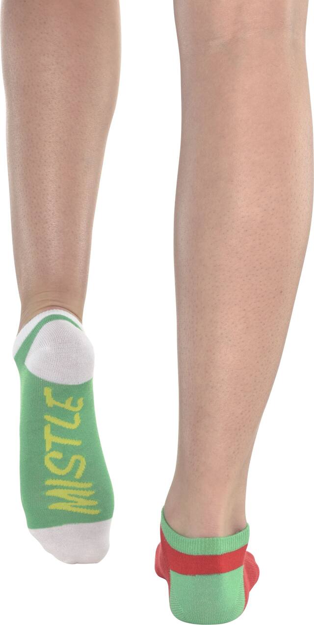 You may be interested in these similar products shown below.Adult Mismatched Mistletoes No-Show Socks are mismatched socks that include one green and white sock with a "Mistle" headline on the bottom and a green and red socks with a "Toes" headline and a mistletoe design on the bottom