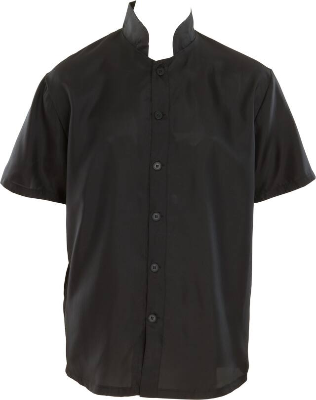 Features a short sleeved black button up shirt with attached white clerical collar