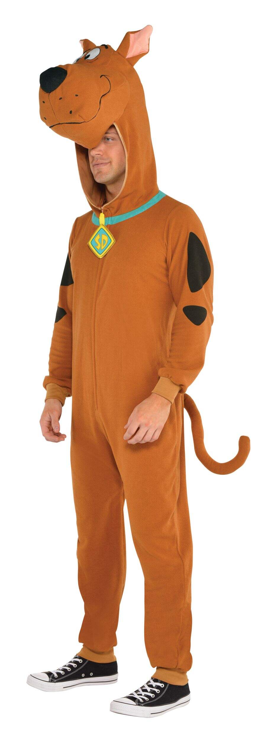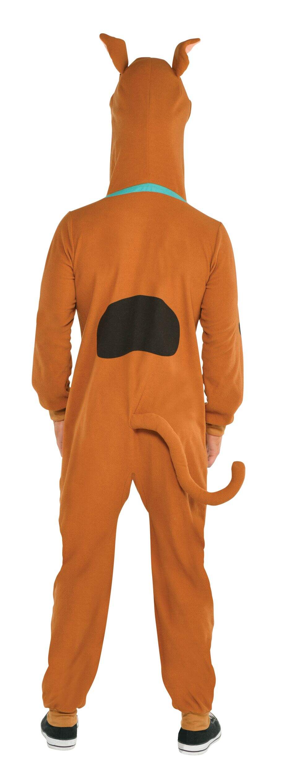Transform into your favorite mystery-solving dog with this Adult Scooby Doo Dog Costume. This cozy brown fleece jumpsuit features a hood and tail, making it perfect for a fun and easy costume. The detachable headpiece adds an authentic touch, ensuring you look just like Scooby Doo.