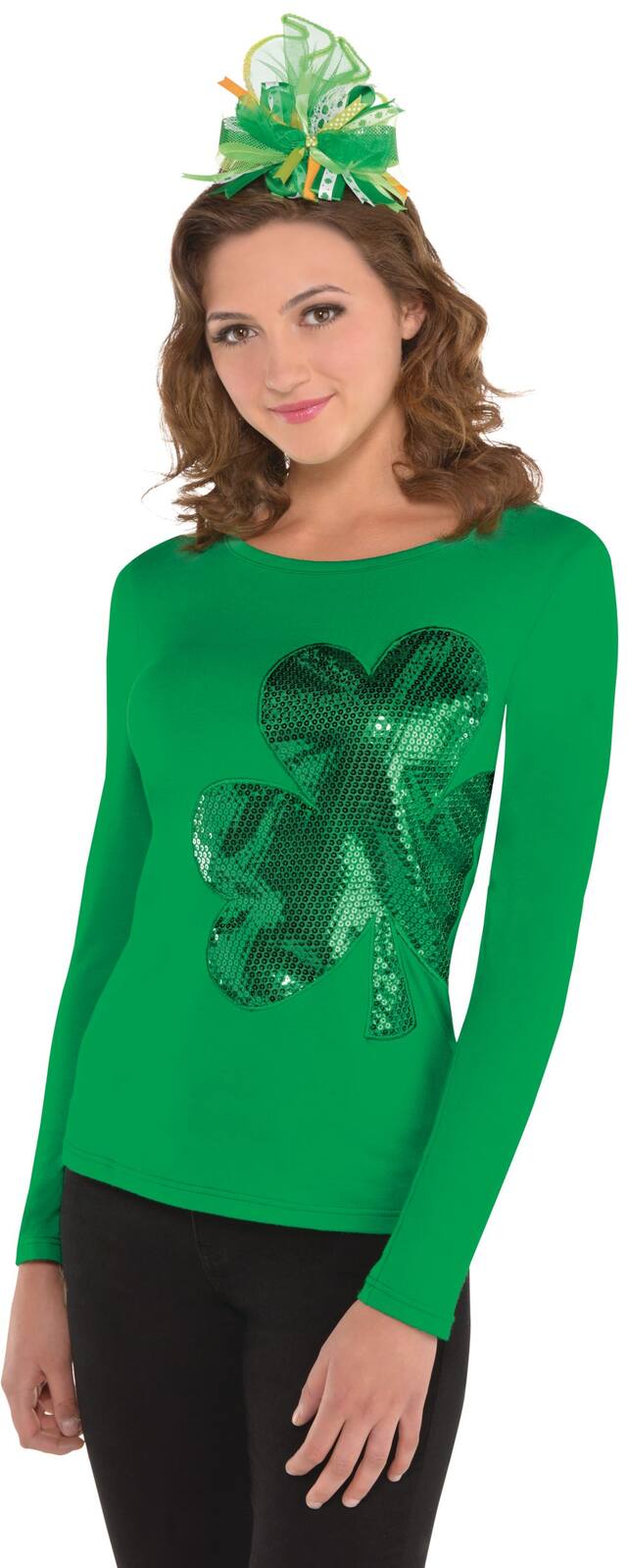 This green polyester long-sleeve shirt features a large green sequin shamrock on the side