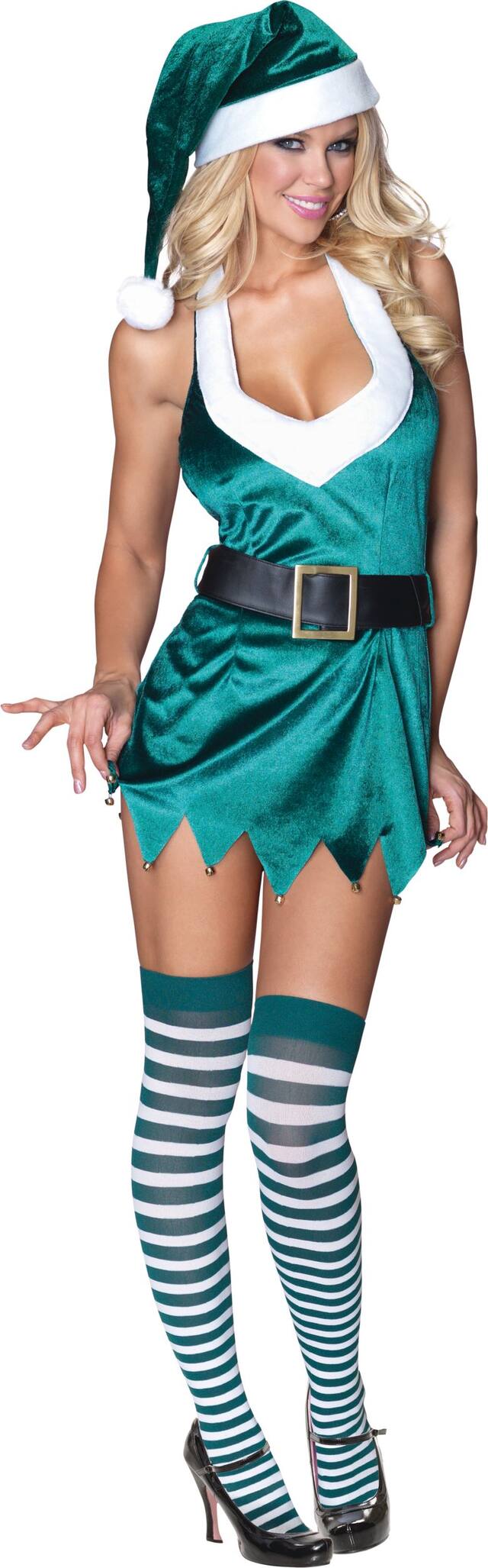 Complete your look with the included green velvet gloves with red faux fur cuffs, wide faux leather belt with a brass buckle, and elf hat headband