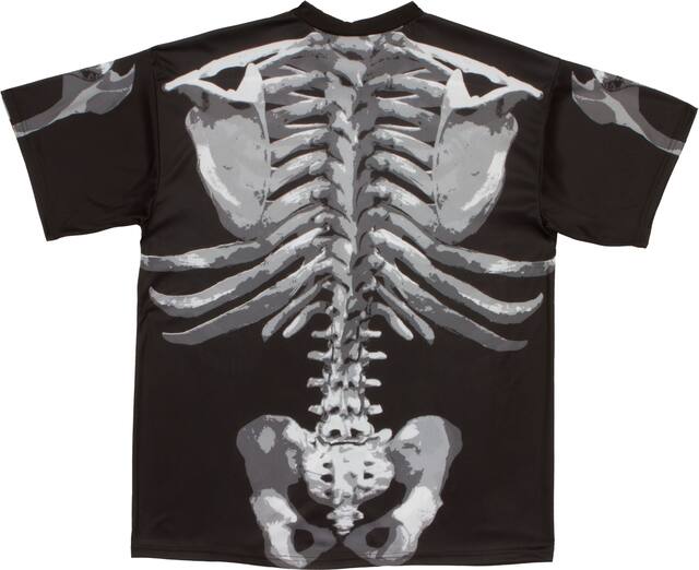 This Black and Bone Skeleton T-Shirt features a creepy true-to-life greyscale skeletal print on both the front and back