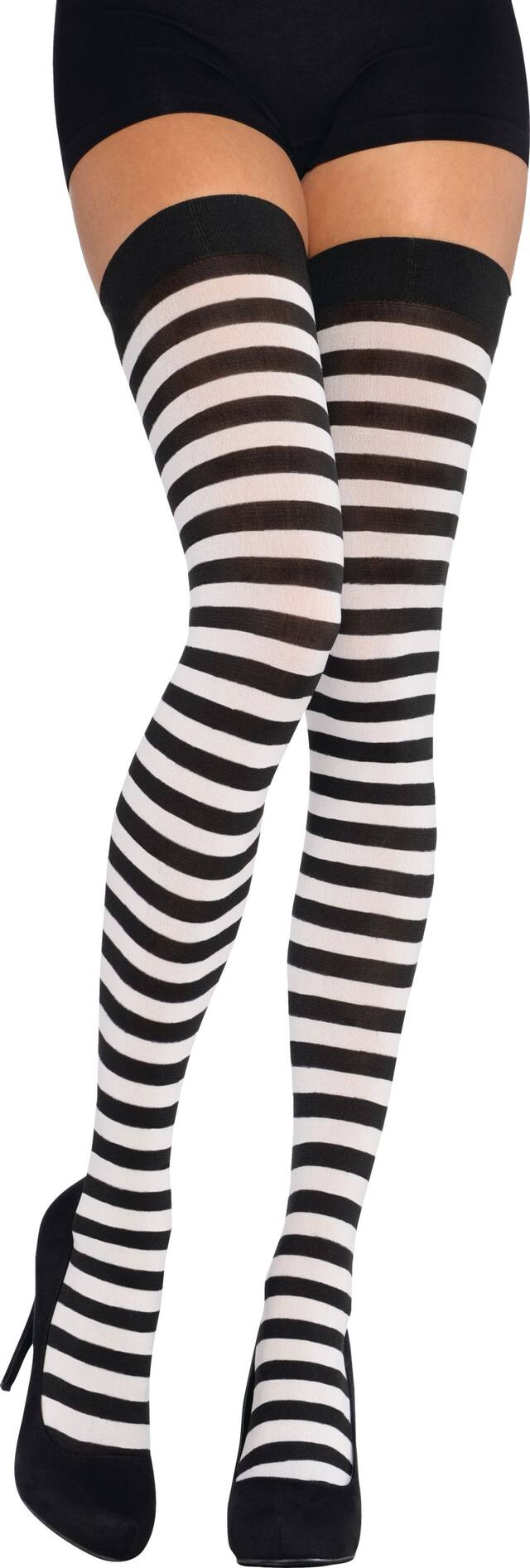 The Adult Black & White Striped Thigh-High Stockings are crafted from stretchy nylon and feature striking black and white stripes