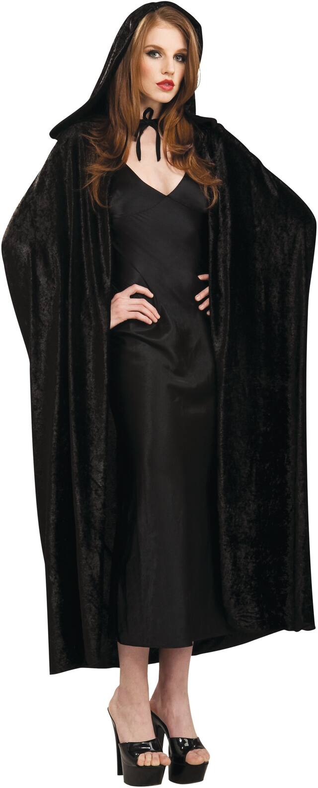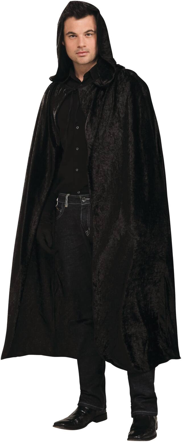 Good or evil, you decide! Our Crushed Velvet Hooded Cloak is all black and full length with a generous hood, collar, and front tie closure; the right accessory for a variety of mysterious looks! Made of velvet-like polyester fabric, this Hooded Cape measures 63-in (160-cm) long. One size fits most teens and adults.