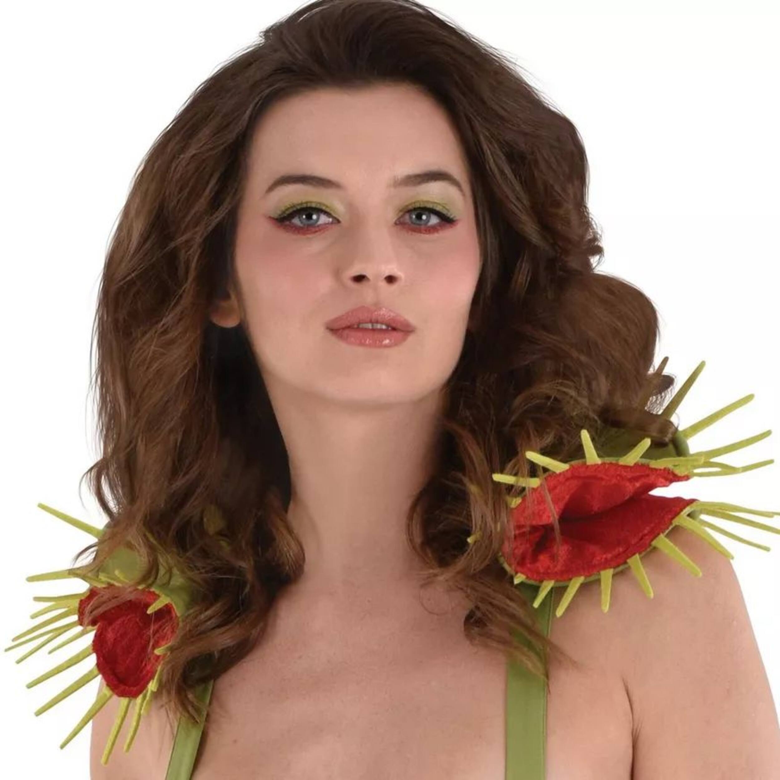 Transform into a captivating Venus Flytrap with this unique adult costume set. Featuring striking epaulettes, a corset with fly trap details, and a skirt designed to resemble the plant's mouth, this costume design is perfect for those looking to make a bold statement. Ideal for anyone wanting to add a touch of nature's bite to their Halloween festivities.