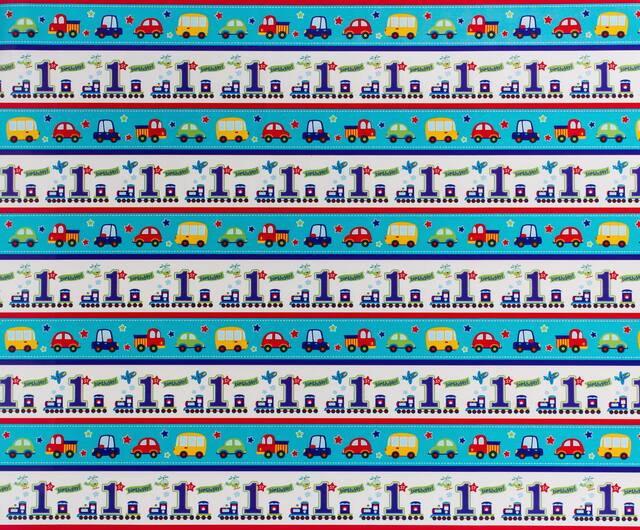 You may be interested in these similar products shown below.All Aboard 1st Birthday Gift Wrap features colourful pictures of cars, trucks, trains, and "1st Birthday" messages driving across blue and white striped patterns