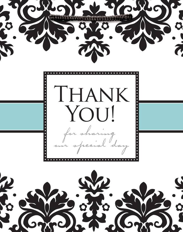 Feature a centre headline that says "Thank you for sharing our special day" with a white, black, and aqua damask motif