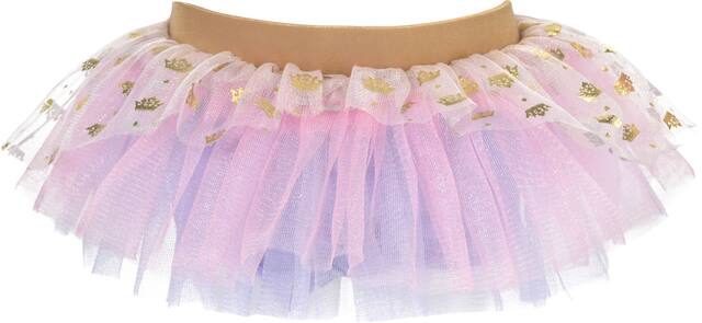 Layers of pink and purple fabric are topped with mesh that's printed with metallic gold tiaras