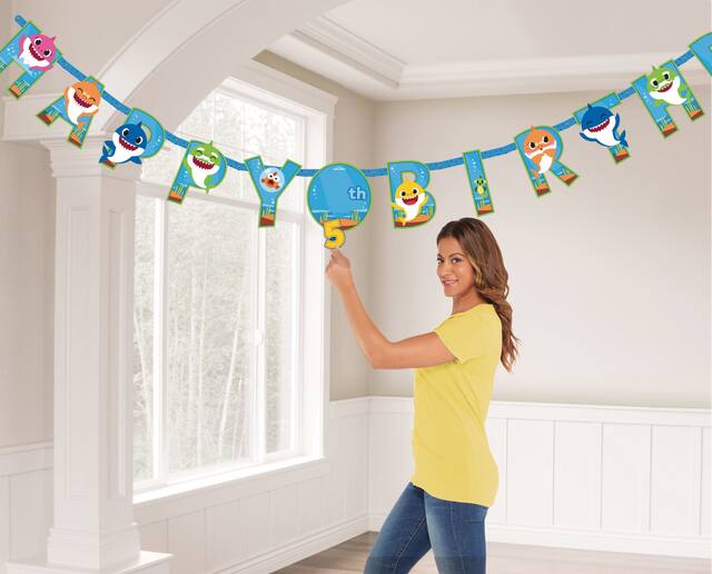 You may be interested in these similar products shown below.Baby Shark Jumbo Add-An-Age Letter Birthday Banner includes a cardstock banner featuring letter cutouts that spell out "Happy Birthday" with baby shark, parent sharks, and grandparent sharks