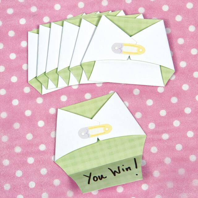 Includes 12 bingo game cards, 12 baby care charades cards, 12 word game cards, 12 diaper surprise cards, pin-it game poster, and 12 pacifier stickers