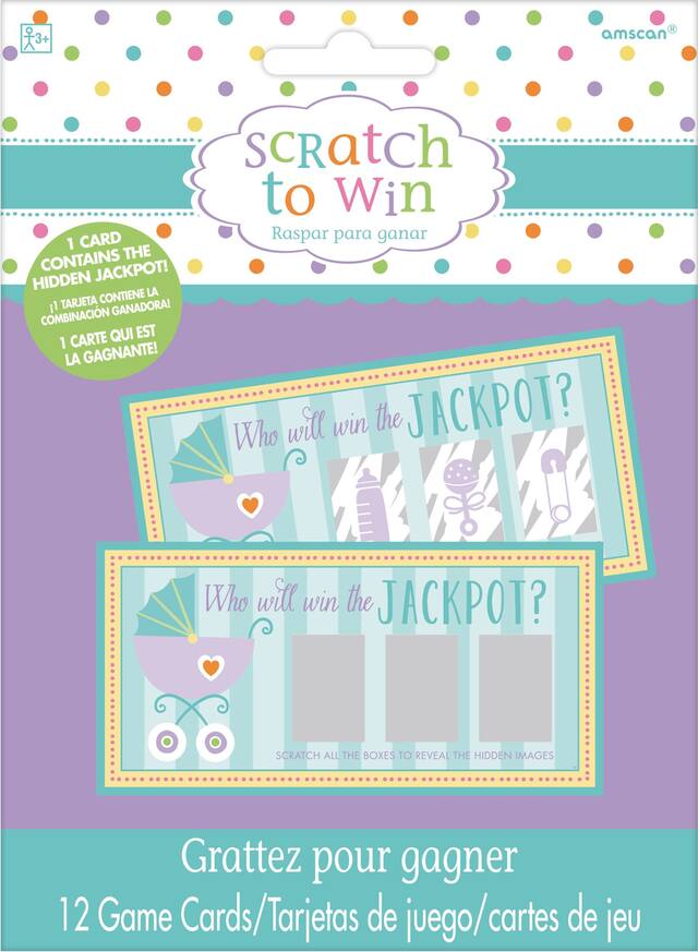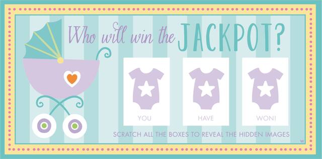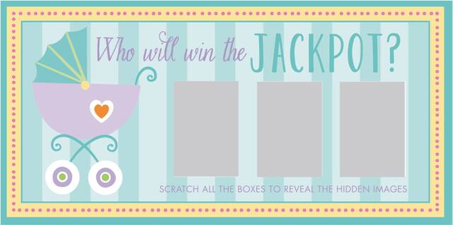 Features a colourful baby buggy print and "Who Will Win the Jackpot?" headline, and 3 windows to scratch off with a coin or key