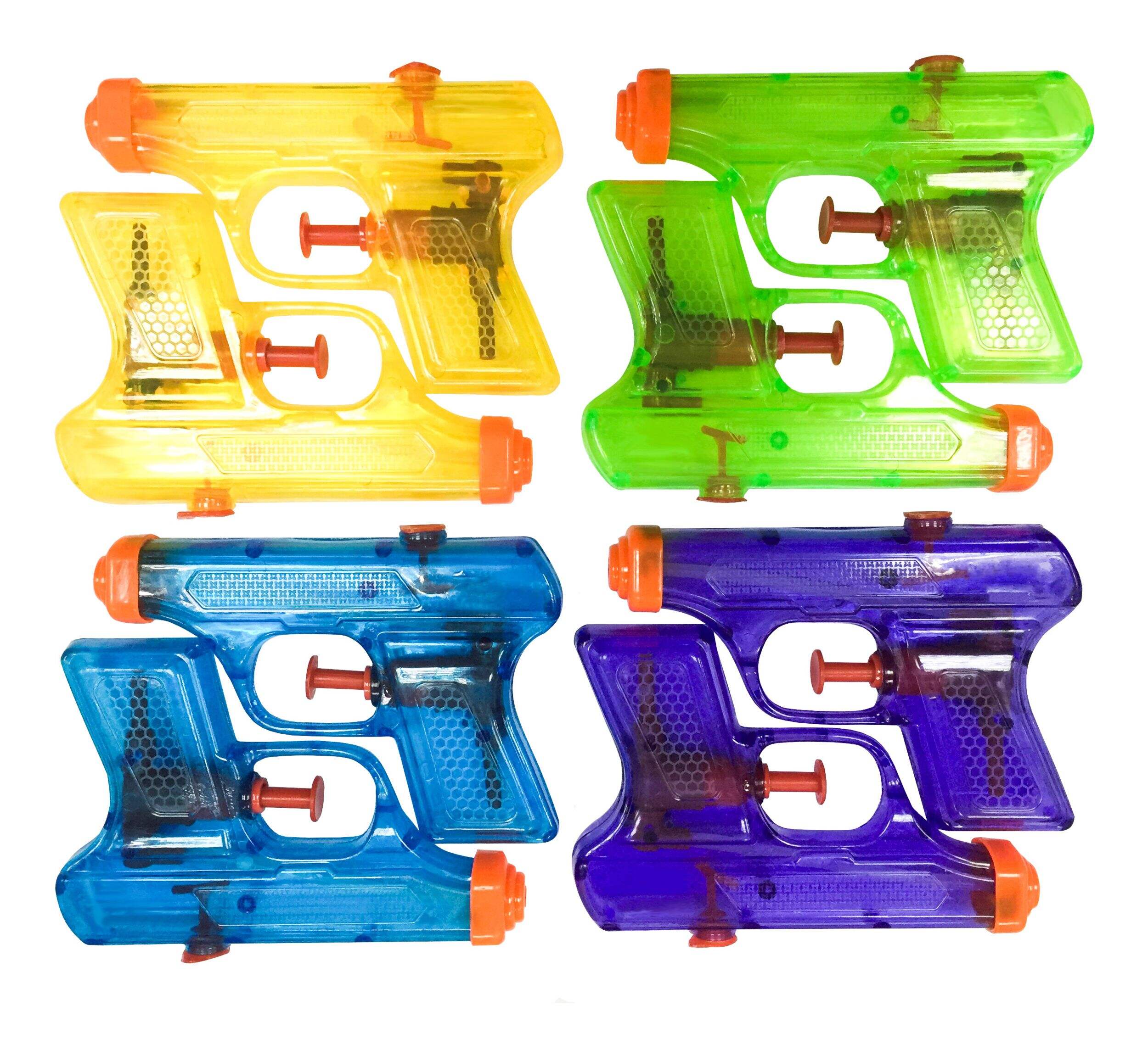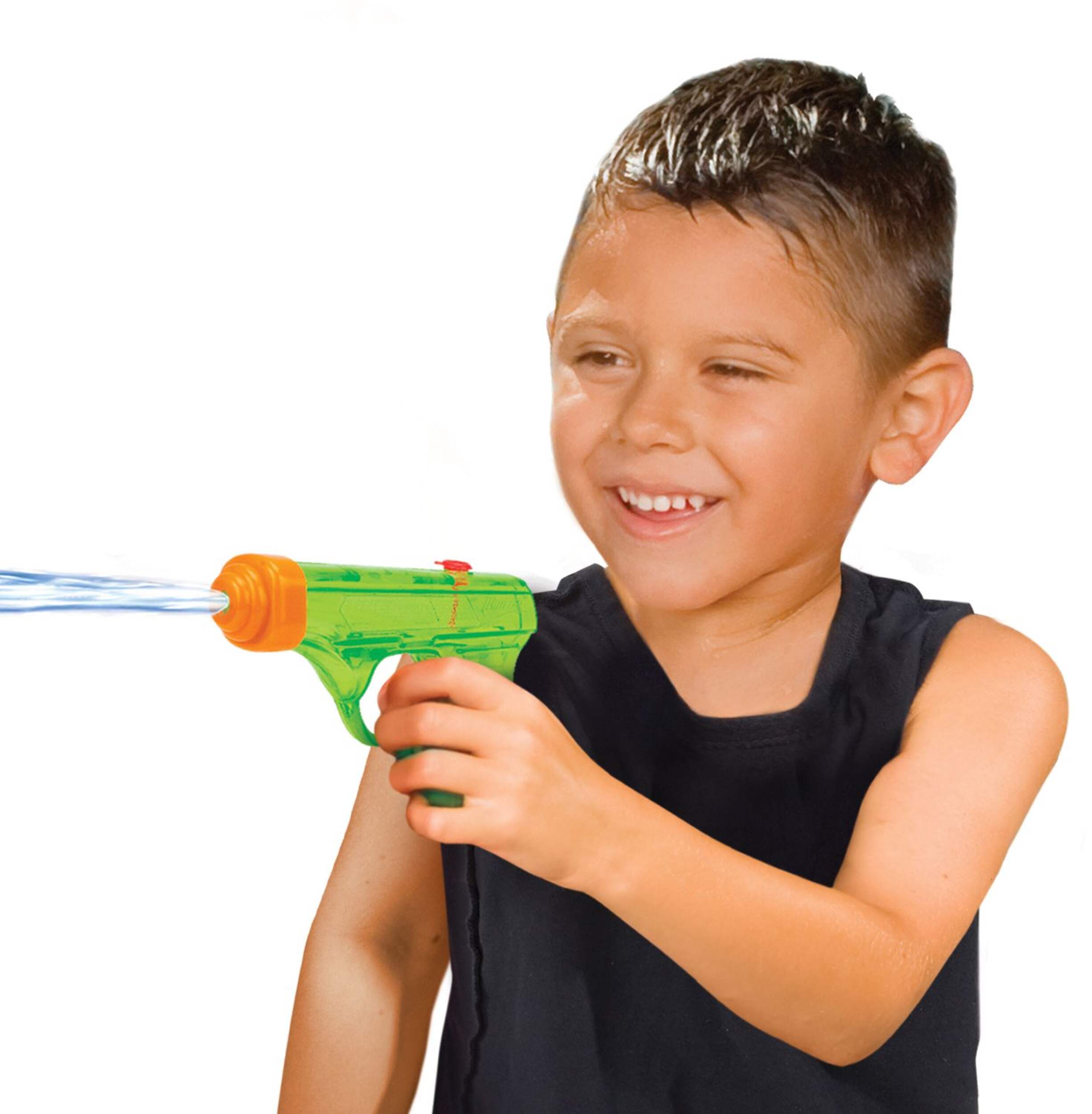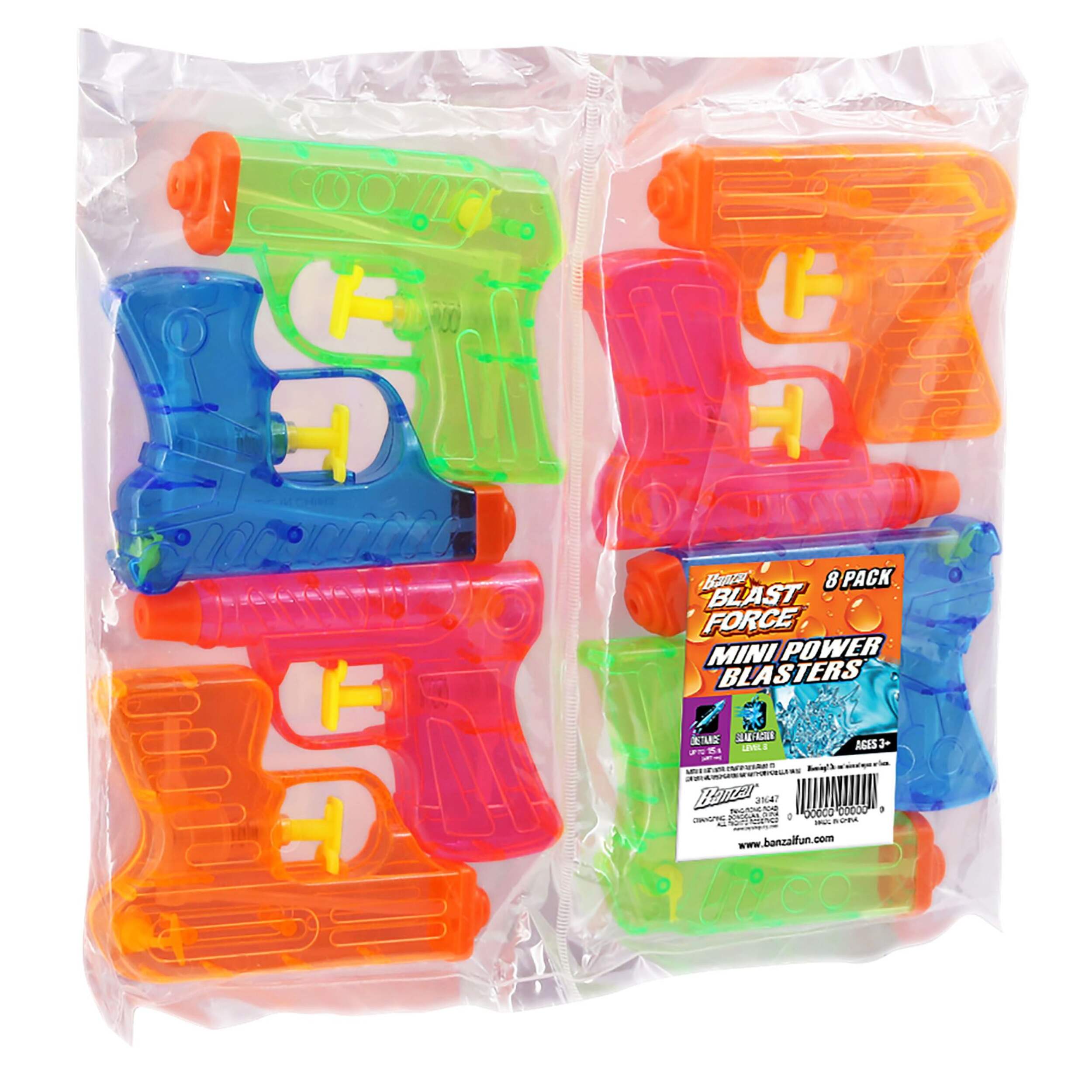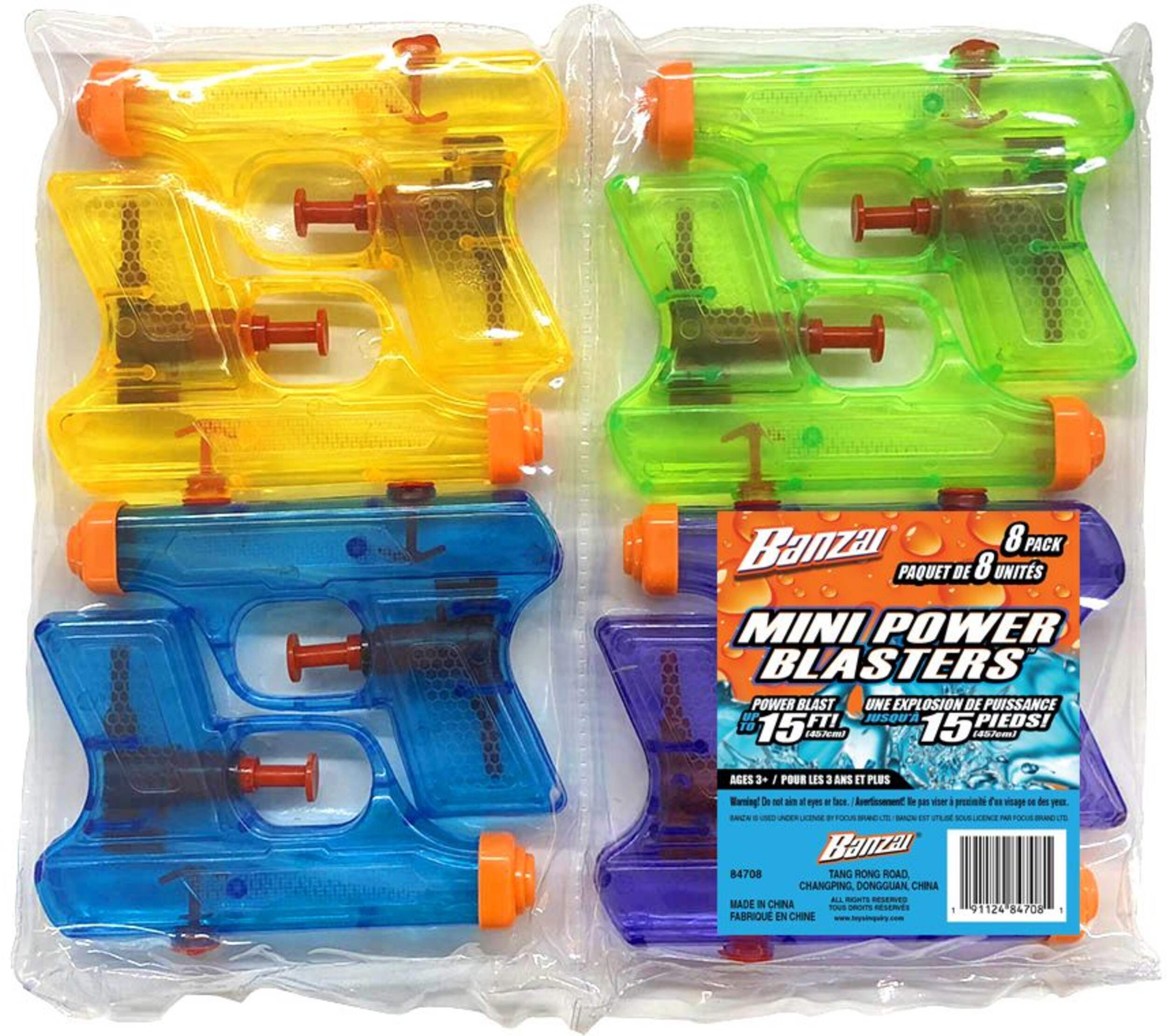 The Banzai Mini Soaker Water Blasters, an exciting outdoor summer play option, are perfect for kids aged 3 and up. Each pack contains 8 mini water soakers, equipped with a pump trigger for quick, easy soaking of targets. These soakers can hold a generous amount of water and offer a shooting distance of up to 15' (4.5 metres), providing endless fun for the young ones. The Banzai Mini Soaker Water Blasters are designed for enjoyment and action-filled water play.