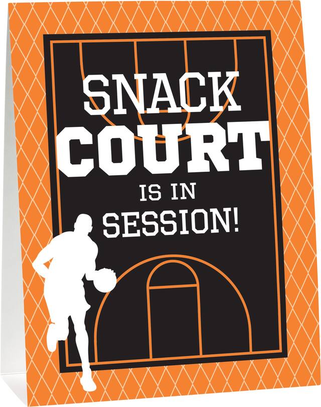 Decorating kit includes tent, cards picks and banners featuring various basketball-themed designs in colours of black, orange and white