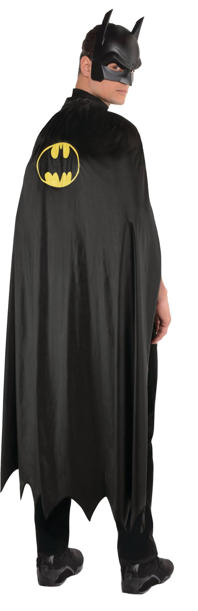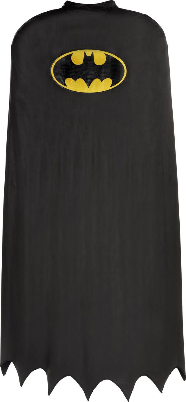 Your Batman costume is incomplete without the Batman Halloween Costume Cape, Adult. This black polyester and foam cape features a scalloped hem at the bottom, a hook-and-loop closure around the neck, and a large black and yellow Batman logo on the back. Use the Batman Cape as a foundation for the rest of your Batman costume and walk into the party in a classic superhero style. The black cape is 50 inches long and features polyester (95%) and foam (5%) construction. One size fits most teens and adults.