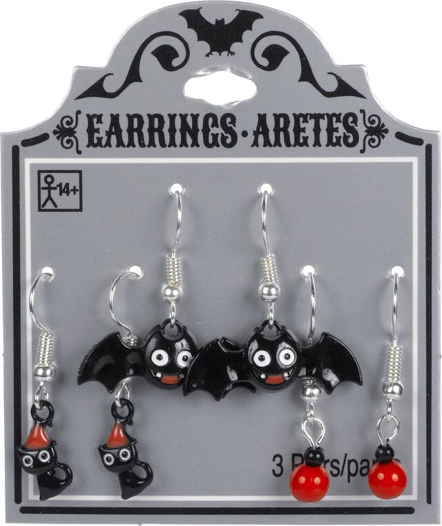 Includes (2) smiling bat earrings, (2) black cat earrings, and (2) orange beaded earrings