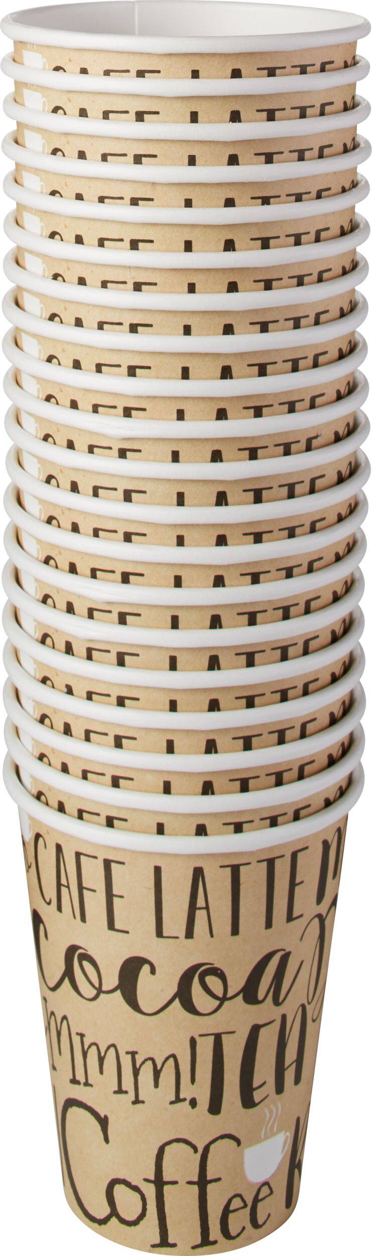 Featuring white coffee mug images and headlines like "Cafe Late," "Tasty," and "Yum," these disposable tan paper cups are perfect for the coffee lovers in your family or office