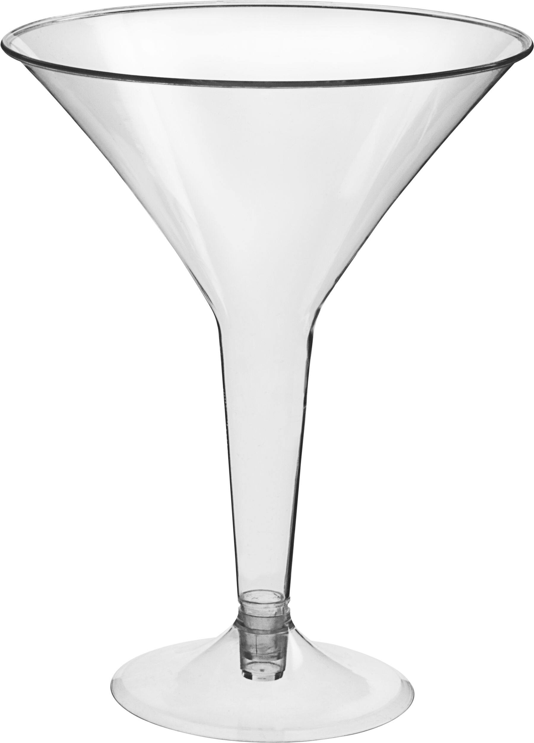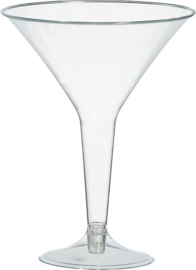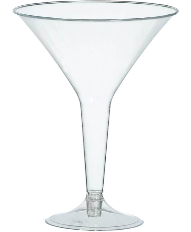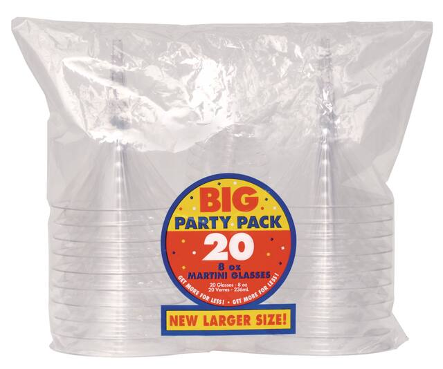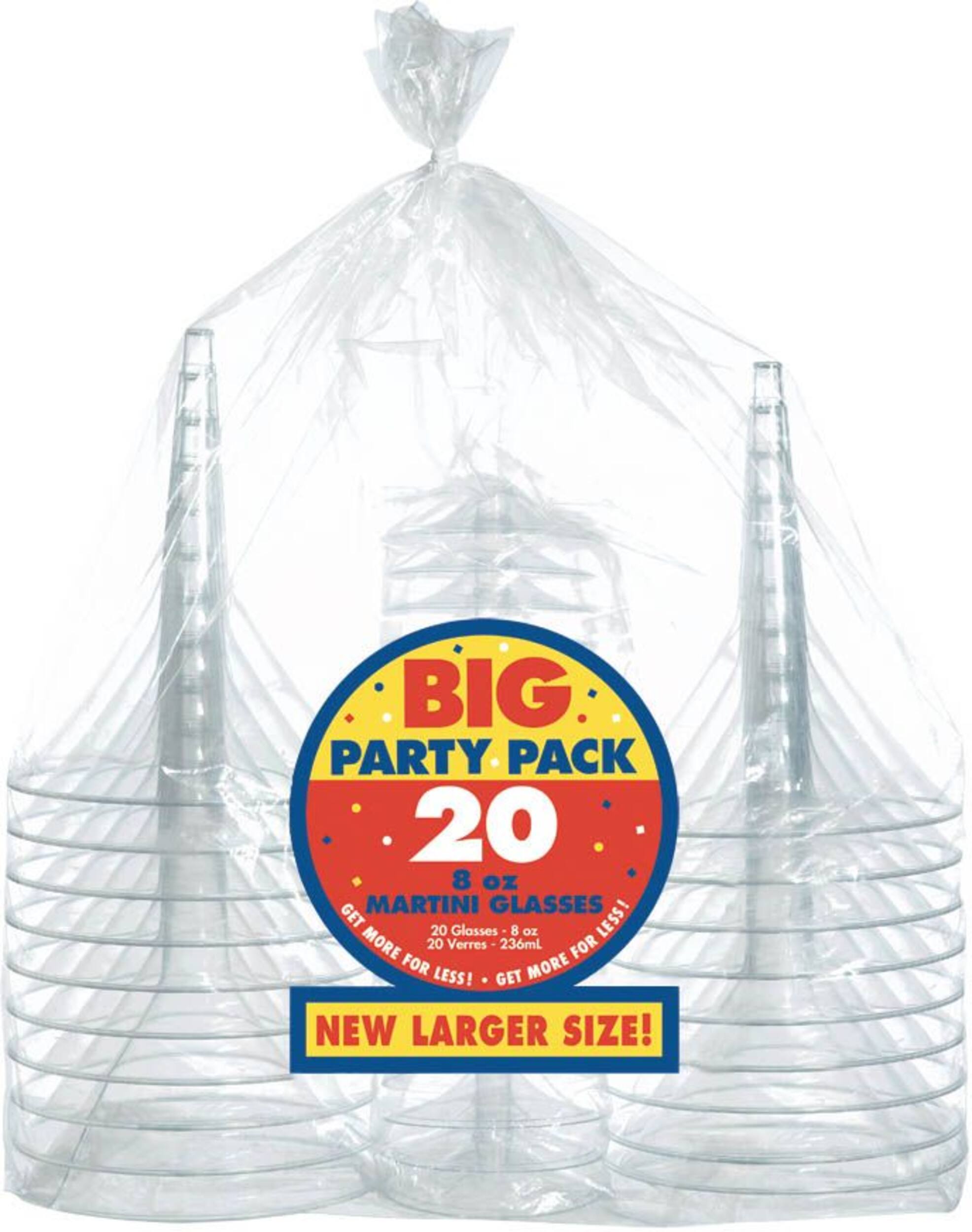 Big Pack Plastic Martini Glasses come in a set of 20 to handle any party you have planned. Whether you're celebrating a birthday, anniversary or just having friends over, these 8-ounce clear plastic glasses are perfect for serving martinis, cocktails and other drinks in style. The disposable martini glasses make for easy cleanup so you can get back to entertaining your guests.