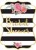 A pattern of horizontal black and white stripes with gold scroll border and floral accents make these large invitations bold and beautiful
