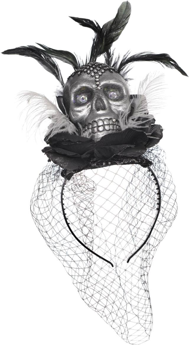 Rule as the queen of the dead in this couture headband, adorned with fabric and featuring a skull in the centre of a faux black rose, alongside a black mesh veil for an extra spooky glam look