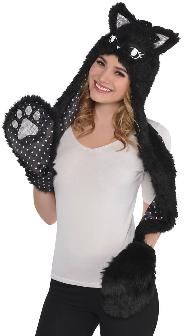 You may be interested in these similar products shown below.This Black Cat Snood features silver-lined cat ears and polka dot lining