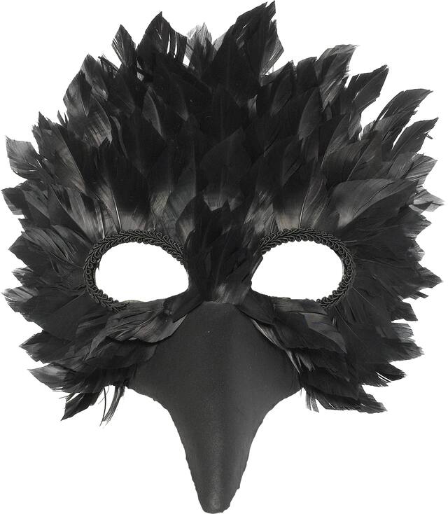 Features two eye holes surrounded by black feathers, a long black plastic curved beak, and an elastic band to keep your mask in place while you're flying around your Halloween party