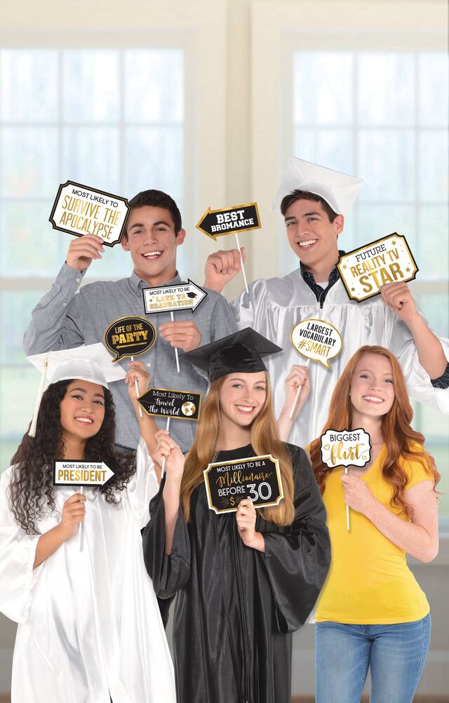 Set includes graduation-themed cardstock cut-outs that feature headlines like "Most Likely To Be President" and "Most Likely To Travel The World"