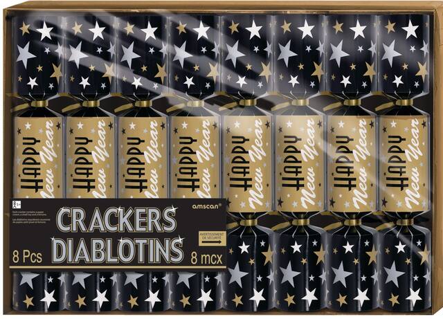 Each cracker is wrapped in black and gold paper with silver and gold stars, and a "Happy New Year" headline