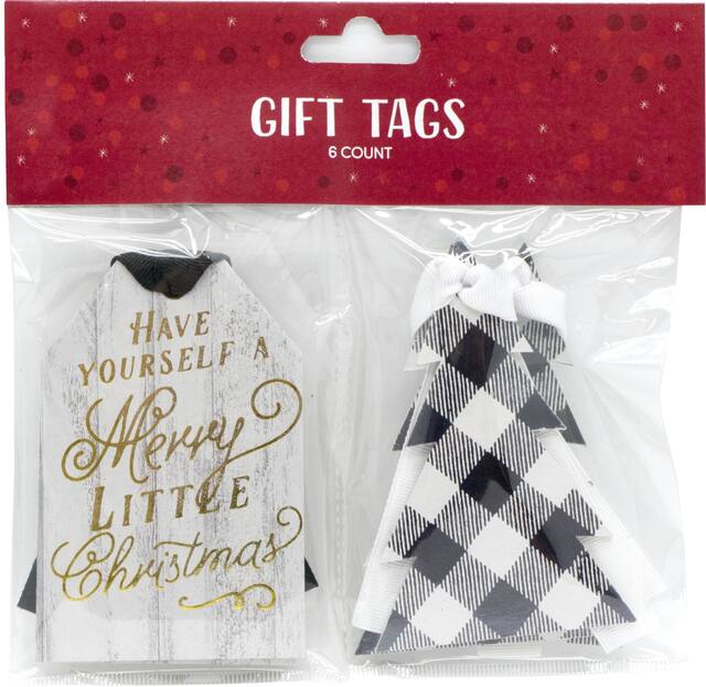 • Black and White Check Christmas Gift Tags feature cardstock tags in 2 designs