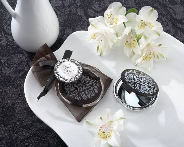 You may be interested in these similar products shown below.Black and White Damask Compact is for when your bridal shower planning calls for elegance
