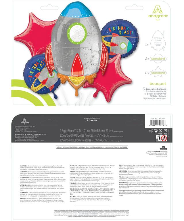 This unique balloon bouquet features a jumbo foil rocket balloon as the centerpiece, perfect for sending birthday wishes into orbit. Two round foil balloons proclaiming "Birthday Blast!" and a pair of red star-shaped balloons complete the set, helping create a bright and cheerful celebration. Helium and ribbon are included, so with just a trip to the store with your receipt the balloons can be inflated, ready to amaze your lucky recipient.