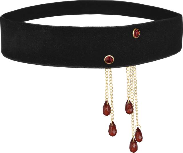 Complete your sultry vampire costume with this black velour choker. It features a thick band with red teardrop faux jewels suspended from gold chains of differing lengths. The chains are attached to red gemstones that resemble a vampire's bite marks.