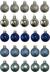 Classic round metal and plastic ornaments are blue and silver with glittery matte and shiny finishes