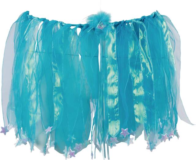 Kit features sparkling blue fairy wings with elastic arm straps and a blue tulle tutu skirt with an elastic waistband