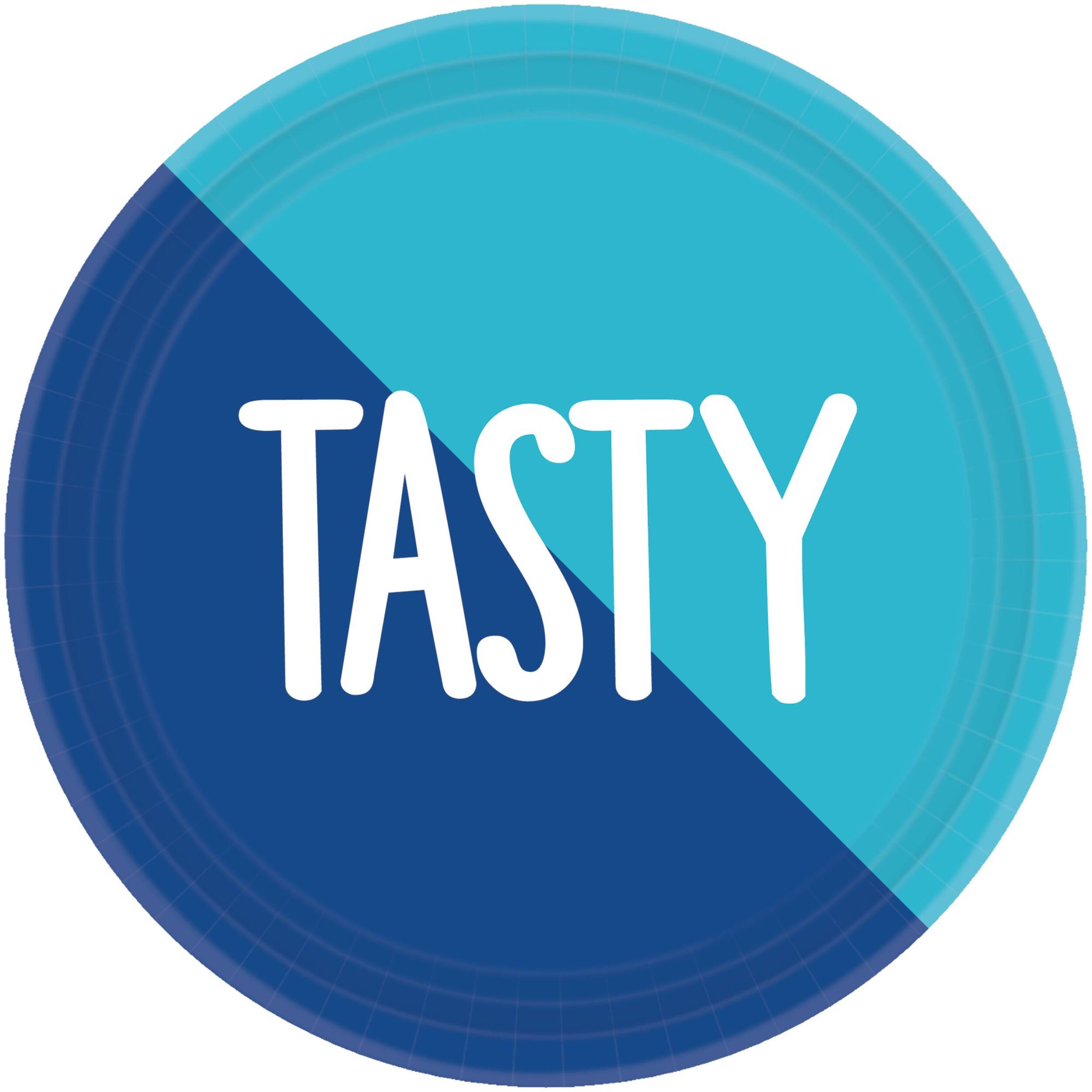 Small round paper plates feature the headline "Tasty" in the centre of a royal blue and Caribbean blue background split diagonally