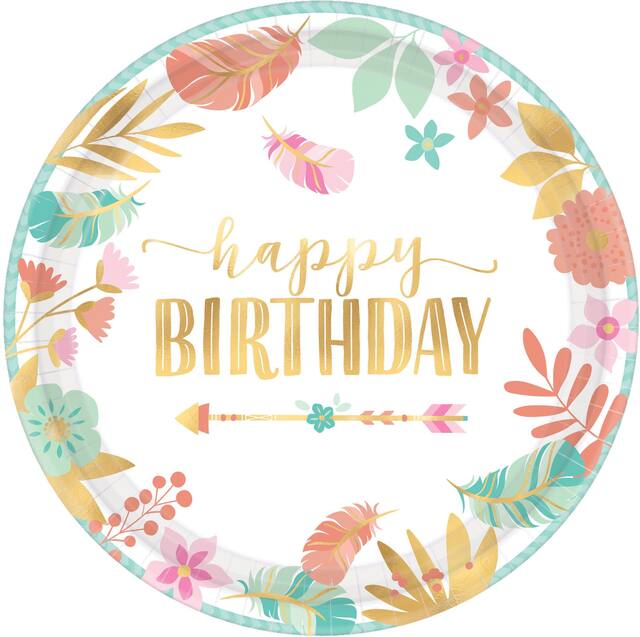 Large paper plates feature a metallic gold "Happy Birthday" headline surrounded by a boho-chic floral border