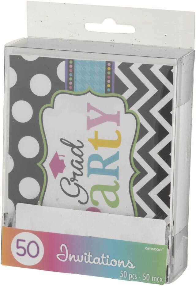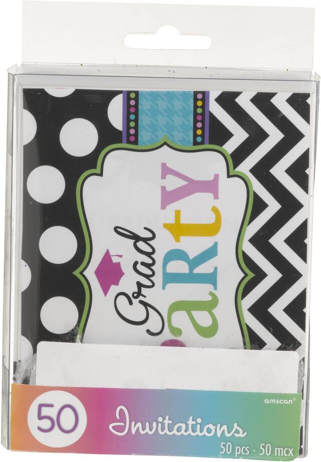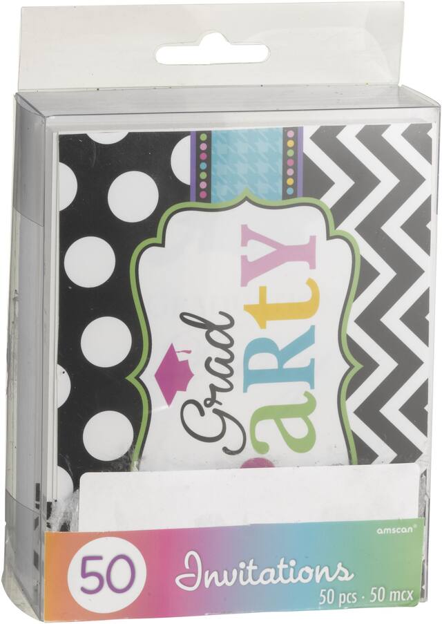 Bright Congrats Graduation Invitations feature "Grad Party" in black and rainbow letters