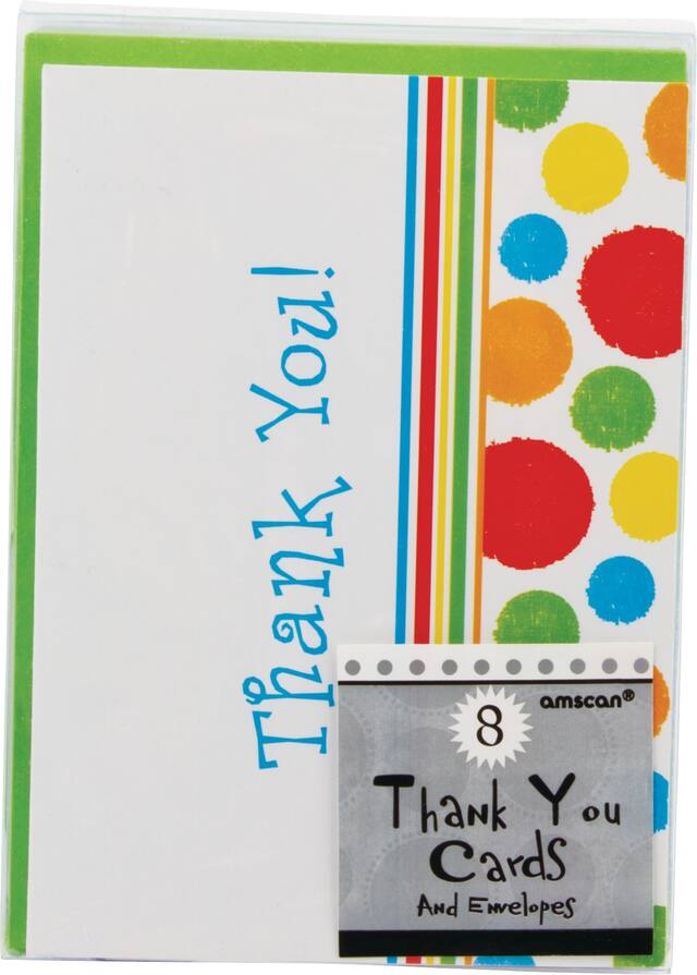 Designed to match the Bright Dots Invitation, they feature a white background with colourful polka dots along the bottom border with rainbow stripes above and a "Thank You " headline