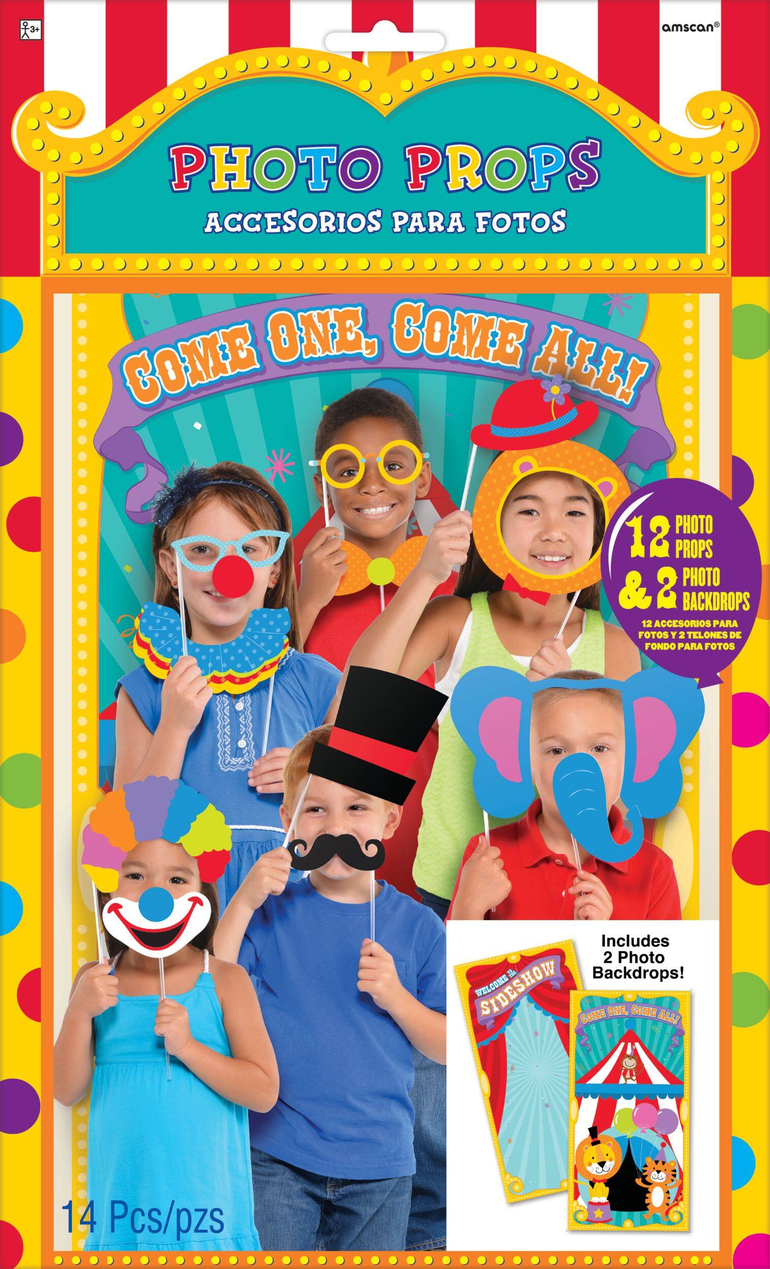 Circus photo props include clown hair, elephant ears, and funny glasses